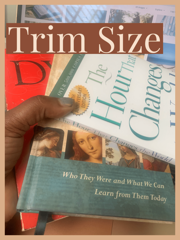 The Trim Size of a printed book refers to its width and height. The most commonly used Trim Size for books in the US is 6″ x 9″ (152.4 x 228.6 mm), but there are other options available. If a book exceeds 6.12 inches (155.5 mm) in width or 9 inches (228.6 mm) in height, it is considered to be a large Trim Size.
